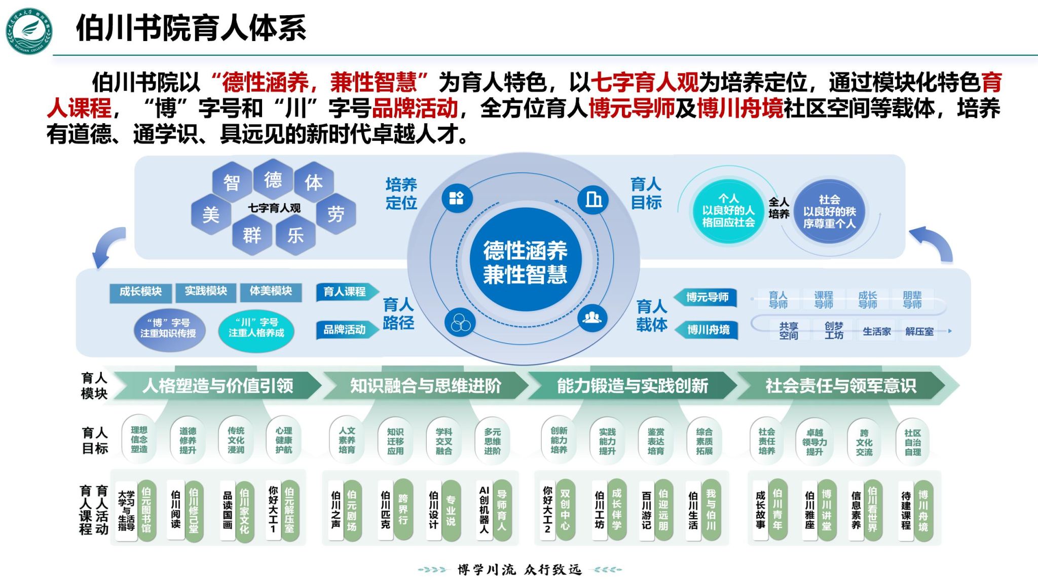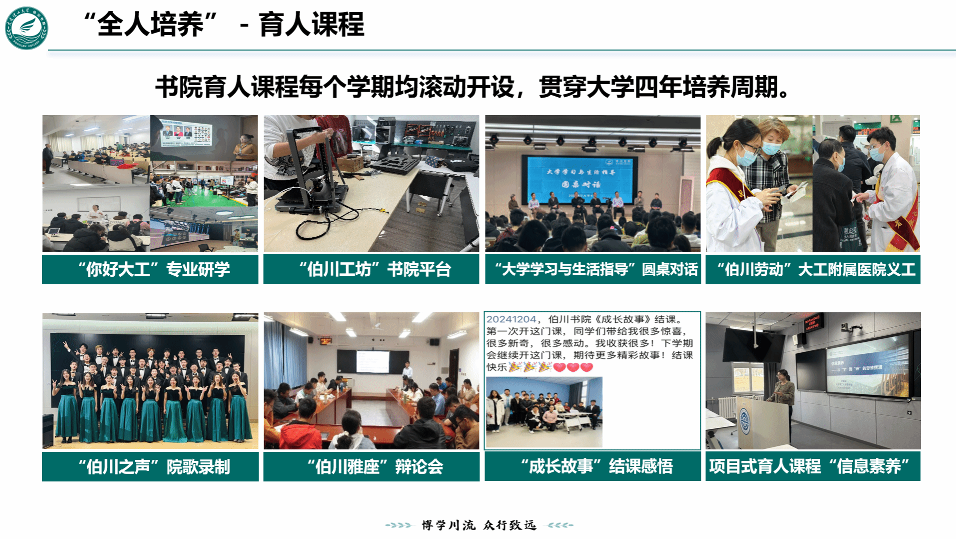 “聚汇博川”品牌活动。“博川”音同“伯川”,基于“博”“川”二字的深厚寓意以及全人培养育人理念,构建“博”字号和“川”字号两大品牌活动,“博”字号注重知识传授,“川”字号注重人格养成。