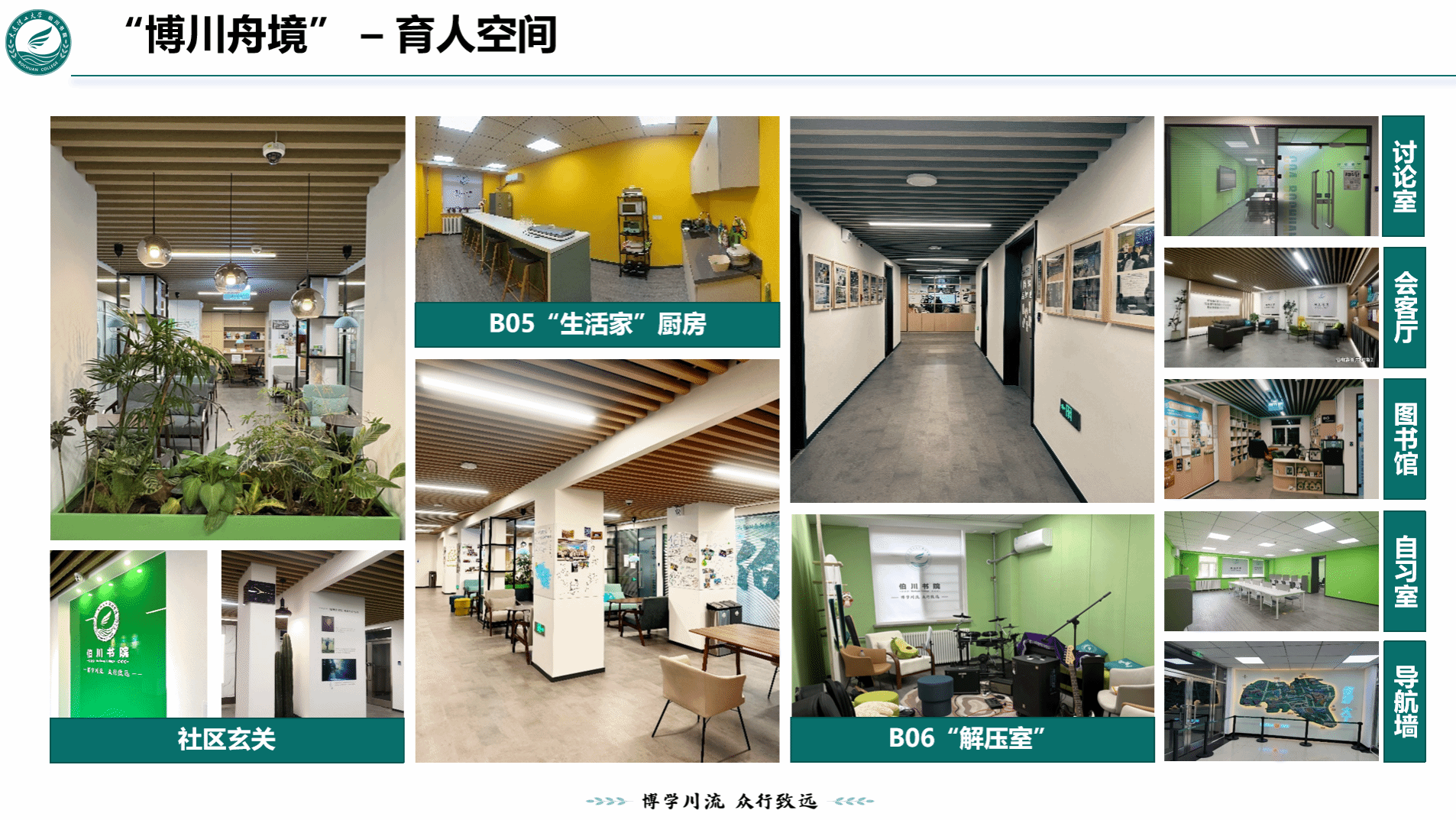 “博川舟境”社区愿景。以“楼为社区、宿舍为家、师生是家人"为理念,建设由学生管理的书院社区,包括伯元图书馆、bo咖啡、解压室、共享空间、生活家、会客厅、研讨室、育人导师工作坊、创梦工坊等特色区域,为师生追求学术进步和个人成长提供可互相支持与合作的社区化氛围环境。