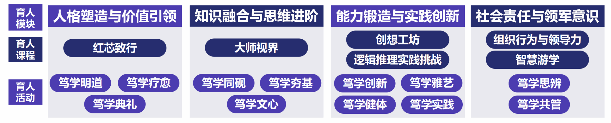 围绕人格塑造与价值引领、知识融合与思维进阶、能力锻造与实践创新、社会责任与领军意识四大育人模块,书院已形成育人课程与育人活动相结合的育人模式。